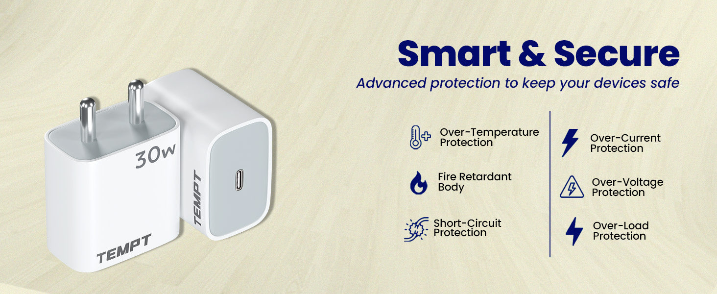 Stay powered with peace of mind. The BOLT 30W PD+PPS Fast Charger is built with advanced multi-layer protection to keep your devices safe while charging. It safeguards against over-voltage, over-current, overheating, and short circuits — ensuring optimal performance without compromising safety. Whether you're charging your smartphone, tablet, or earbuds, you can trust BOLT to deliver secure and reliable power every time.