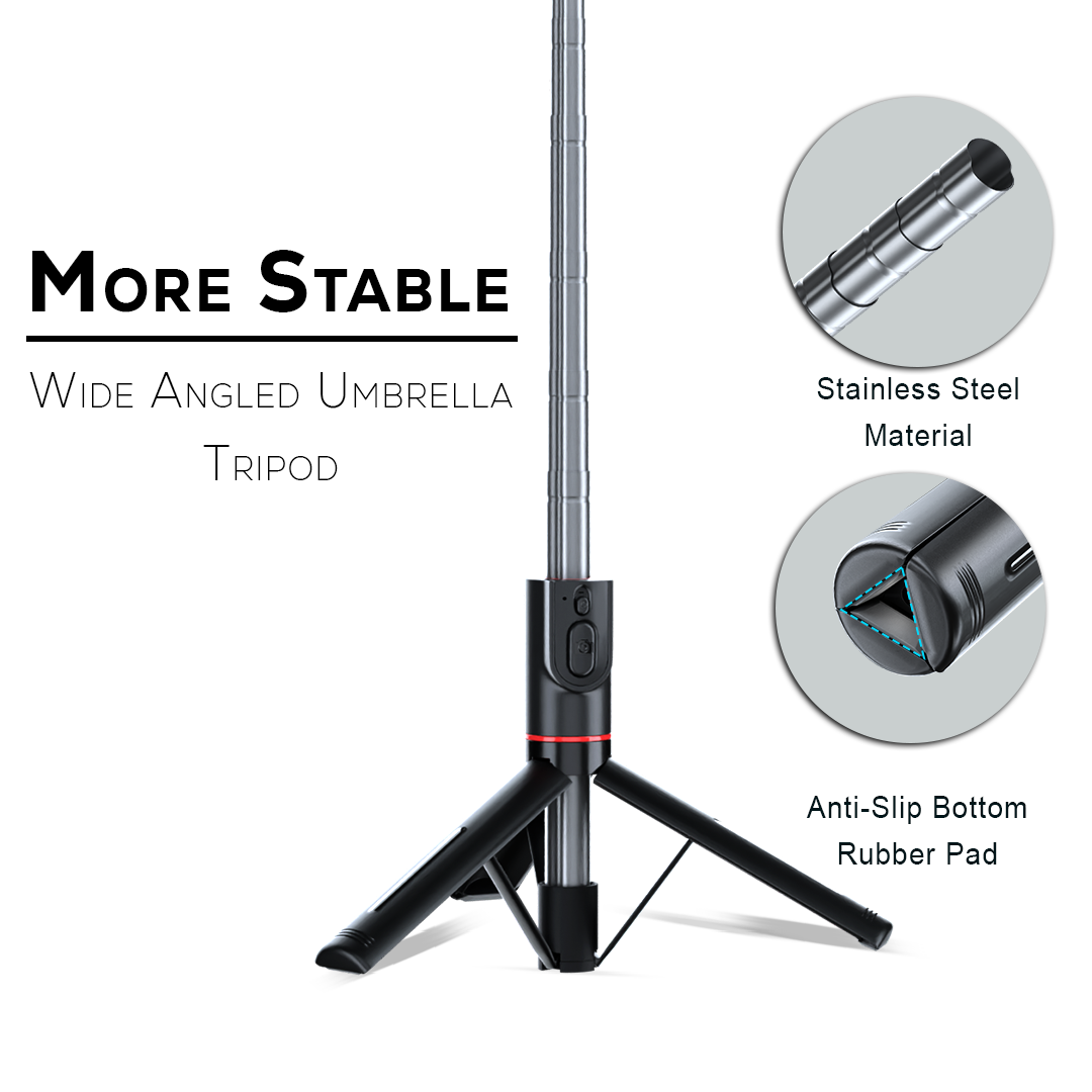 Designed with a wide-angled umbrella tripod for stable, hands-free shooting. Crafted from high-quality stainless steel, this durable tripod provides a robust and reliable base for your device, ensuring it stays securely in place. The anti-slip rubber pads enhance stability, preventing slips or wobbling, even on smooth surfaces.