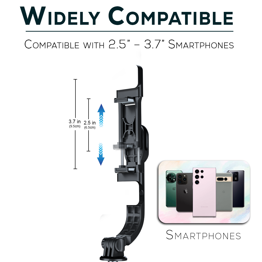 Selfie stick is designed for wide compatibility, supporting smartphones ranging from 2.5" to 3.7" in size. Whether you have a compact device or a larger phone, this adjustable holder securely grips your smartphone, ensuring a stable and reliable connection. Versatile design makes it an ideal accessory for users with different phone models, ensuring an effortless and secure fit for all your mobile photography adventures.
