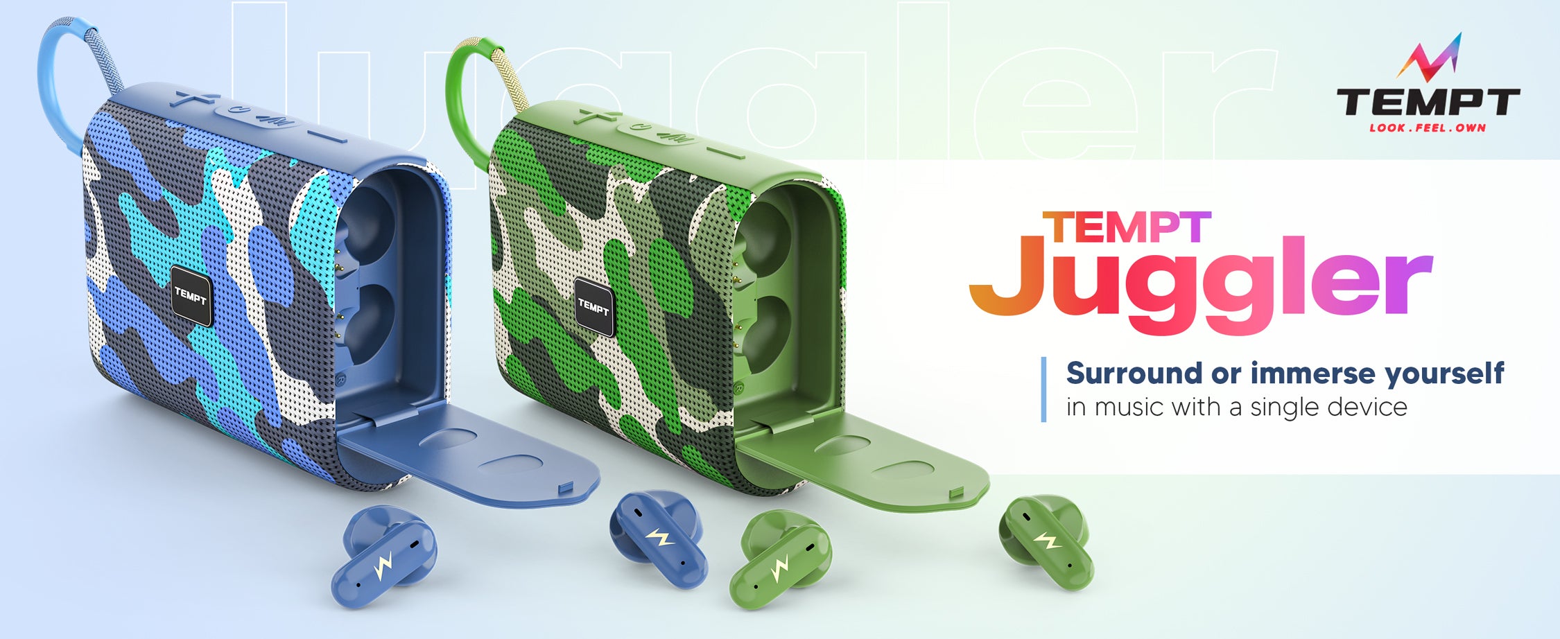 - Easy Connectivity: With the latest Bluetooth V5.1 technology, the Tempt Juggler portable speaker box offers fast and easy connectivity to your devices. Additionally, its wireless earbuds have Bluetooth V5.3 and BLiNK technology that makes connecting to your device within seconds possible.