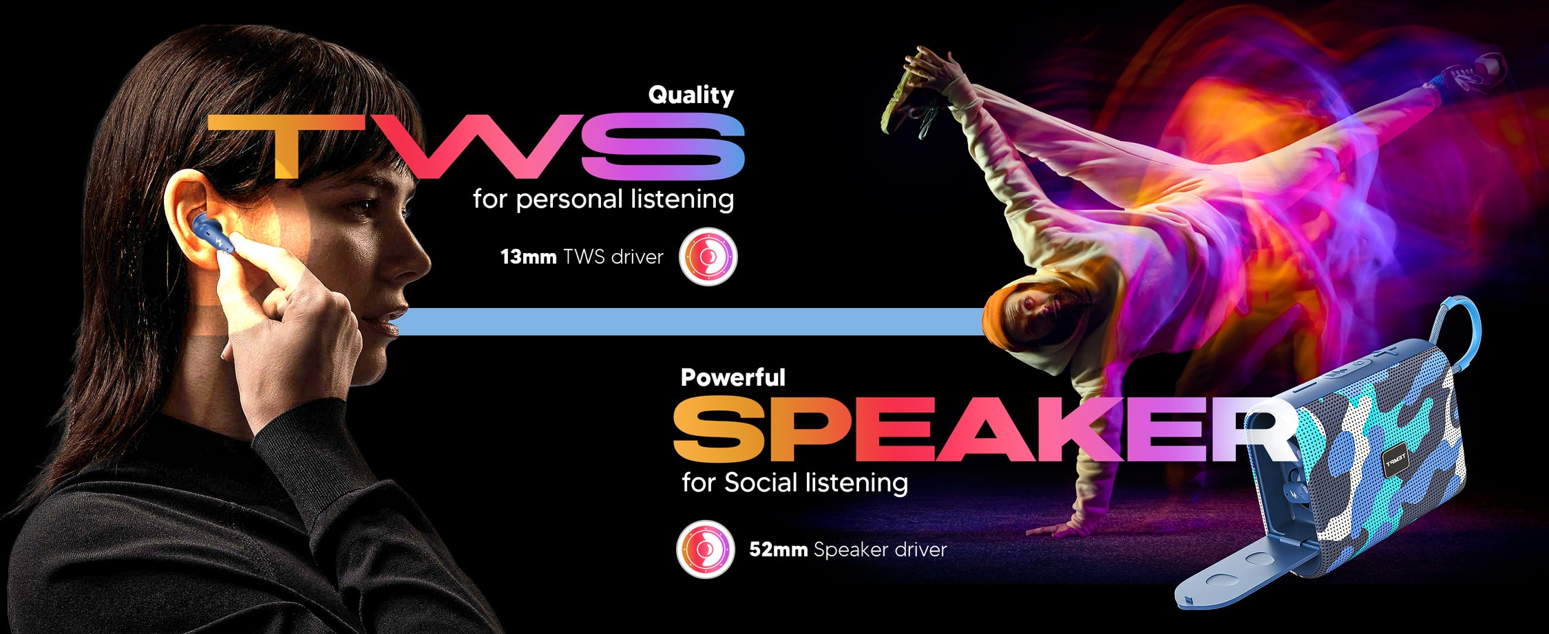 The speaker connects via Bluetooth 5.1, while the detachable TWS earbuds use Bluetooth 5.3 with BLiNK technology for ultra-fast pairing.