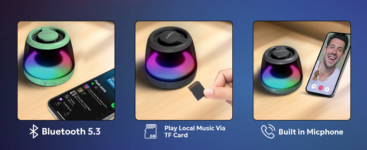 Yes! The Tempt Cameo supports TWS pairing for immersive stereo sound. It also works via Bluetooth, TF card, and has a built-in microphone, making it perfect for calls, music, or video streaming.