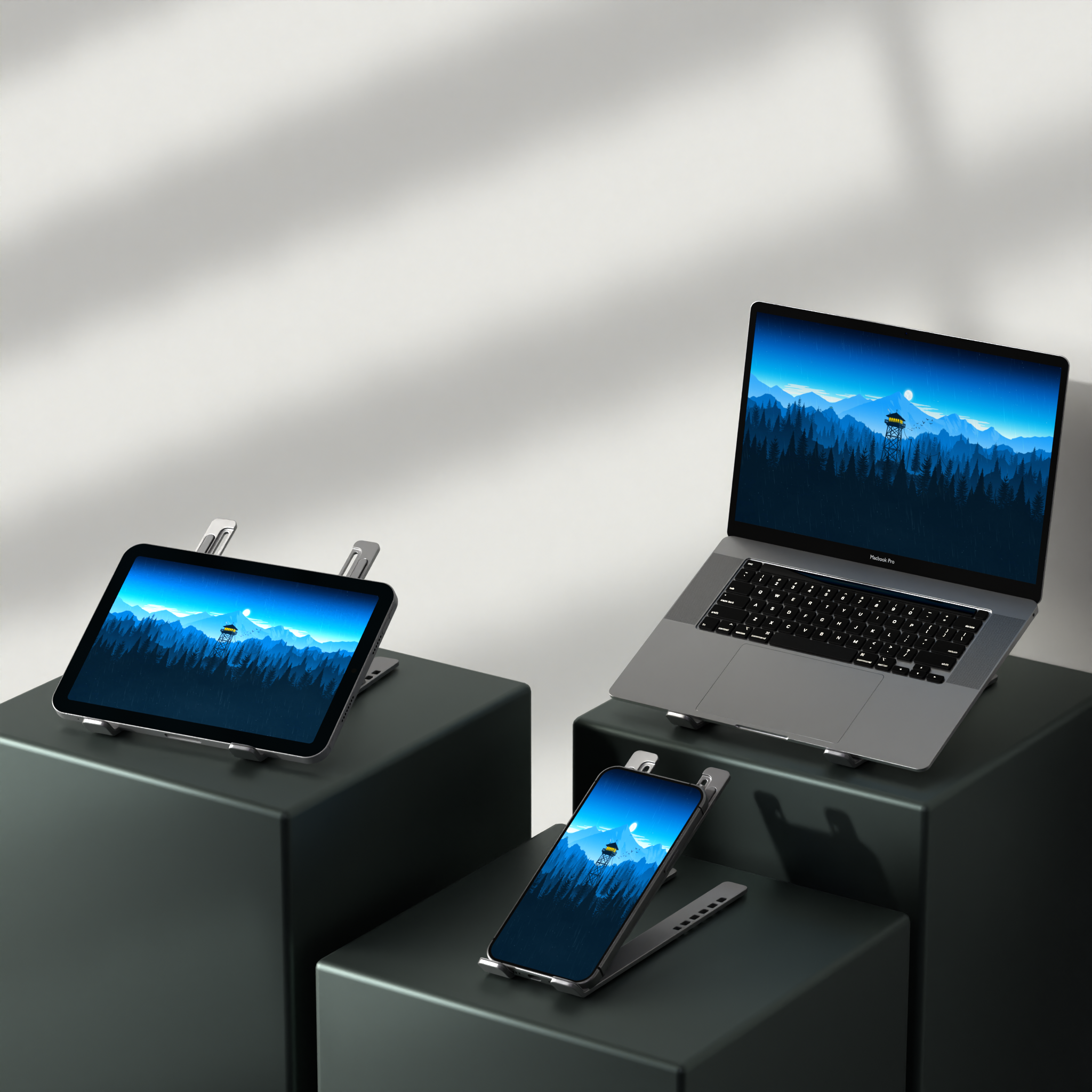 Upgrade your workspace with our premium Laptop Aluminum Stand, a perfect blend of style, functionality, and durability. This ergonomic laptop stand elevates your device to an ideal viewing angle, helping to minimize neck and eye strain during extended use. Crafted from robust aluminum, it ensures a stable laptop holder for enhanced productivity. The open design promotes optimal airflow, doubling as a laptop cooling stand to prevent overheating and boost device performance. Anti-slip silicone pads secure your laptop while protecting it as a scratch-resistant laptop stand. Lightweight and foldable, this portable laptop stand is easy to carry, making it a versatile addition for on-the-go professionals.