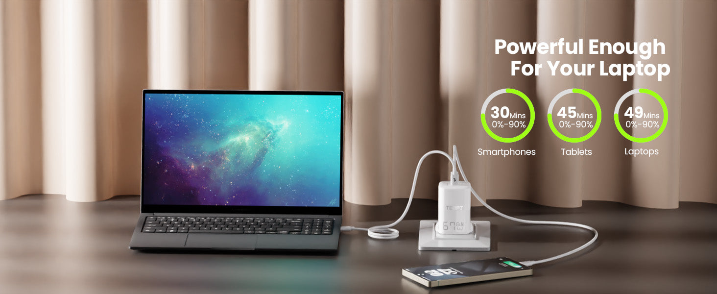 Superfast Charging: Charge smartphones to 80% in 30 mins, tablets in 45 mins, laptops in 49 mins.