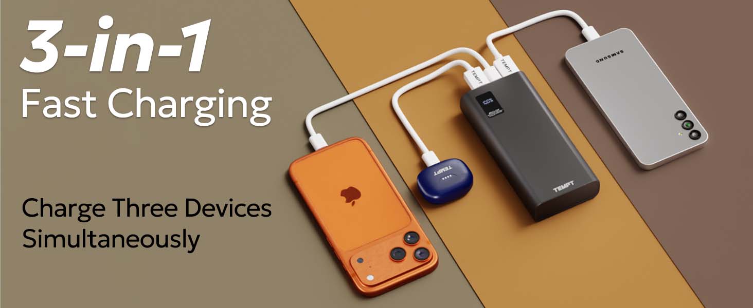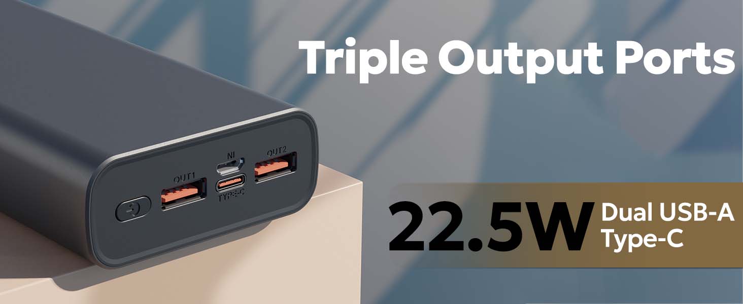 - Triple output ports (Type-C + Dual USB-A) charge up to three devices together.