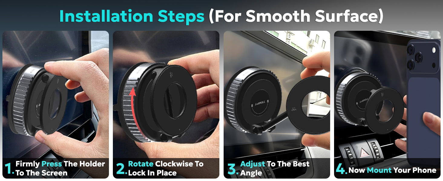 - Works with phone cases, flat & textured surfaces